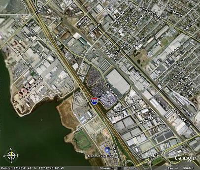 - Tidewater/Oakport/High St. Estuary: This is essentially across the Nimitz (I-880) from Coliseum North. It’s an industrial area with one intriguing fact: 11 acres of it is owned by the East Bay Regional Parks District. PG&E has a 15-acre facility across the street. The site is obviously not very close to BART. The site is in the upper left quadrant of the picture below.