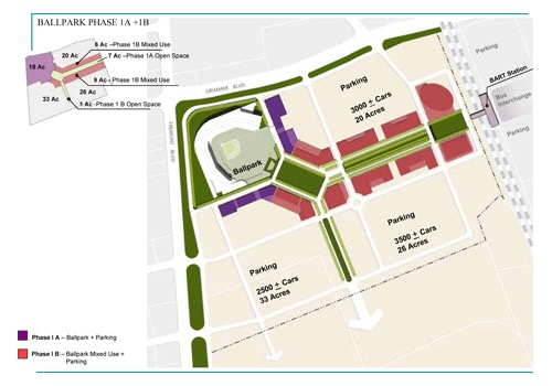 The distance along the new pedestrian promenade would be around 1/4 mile. The City expects BART parking on the other side of the station to be used for the ballpark, so the station and bridge would be constructed in a manner that allows for walking through the station without having to enter a paid area. The vision doesn’t end there. The drawing above is considered Phase 1A. Phase 1B would involve the construction “of approximately 920,000 square feet of land and building area devoted to office, retail, and restaurant development along the promenade.” Should that come to fruition, the area would look more like this: