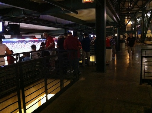 Fortunately, I was able to find a hidden gem of a spot in the back of the 100-series sections, which are really the back of the lower deck. The way the place is constructed, the concourse gives access to Row 28 of the lower deck. Another 10-12 rows are set up behind the first 28, with a large platform behind the last row above the lower concourse concession stands. The view of the game is somewhat restricted because of the overhang and columns, but if you find a decent spot it’s a great place to stand. Or even sit, if you know where to look.
