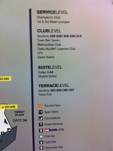 Another oddity is the naming of the sections. Here is another case where the neighborhood concept goes a bit awry. Along the Club level are 200-sections, but there are also non-Club sections named S through Z. Go up to the upper deck and there are both 200- and 300- numbered sections. What? If that doesn’t sound confusing enough, try to make sense of the legend below.