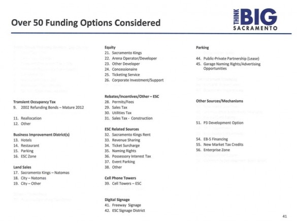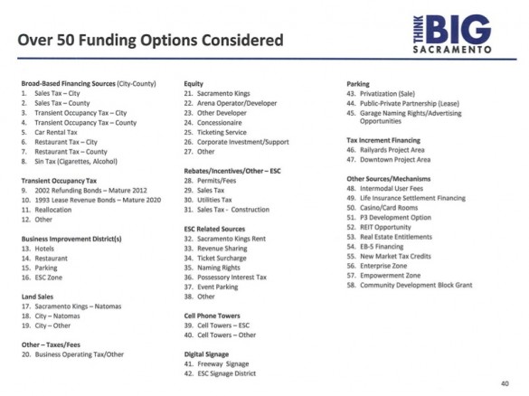 Doesn’t tell you much, does it? The conclusion actually belies the other key information within the presentation. For instance, BSG studied every possible public financing option, from taxes to fees to the sale of parking rights. Here’s the entire list: