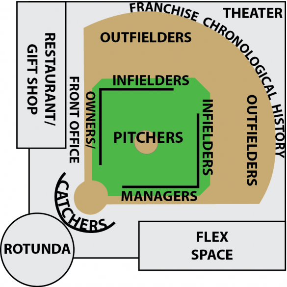 The premise is simple. You start off in the rotunda area, which would be paved with bricks of leading donors. You enter to the right and reach the on-deck circle. Once there, you can either go to the restaurant or forward into the main hall. Follow the diamond to check out the franchise’s great managers, or go left to check out catchers and pitchers. Dressed-up lockers would contain exhibits for hall-of-famers or other greats. Round first and you can split off into either infielders or outfielders. End the tour with exhibits for owners and general managers (does Connie Mack get two exhibits?), or walk along the outer wall to go over the franchise’s entire history. Various islands throughout would have educational information about baseball for children, and the whole experience would be accompanied by custom iPad/iPhone apps. There’s also a theater for multimedia presentations.
