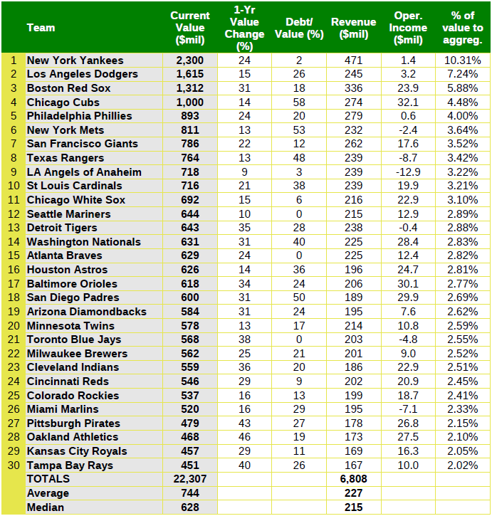These new valuations result in an aggregate $3.5 billion rise over last year. The A’s, who were last in 2012 with a $321 million valuation, are now 28th with a $468 million valuation. That’s a whopping 45.8% gain, all without negotiating any lucrative new media deals or the benefit of new ballpark revenues. $468 million is reflective of the new national TV deals that MLB will receive starting with the 2014 season. Even with the increase, the A’s are $160 million below the media franchise value and $276 million below the average valuation. For reference, the big market Giants got a $143 million boost and moved from 9th to 7th place. As we observed last year, the bubble is real. Thanks to baseball’s solid, diverse revenues, the bubble is also not going to burst anytime soon.