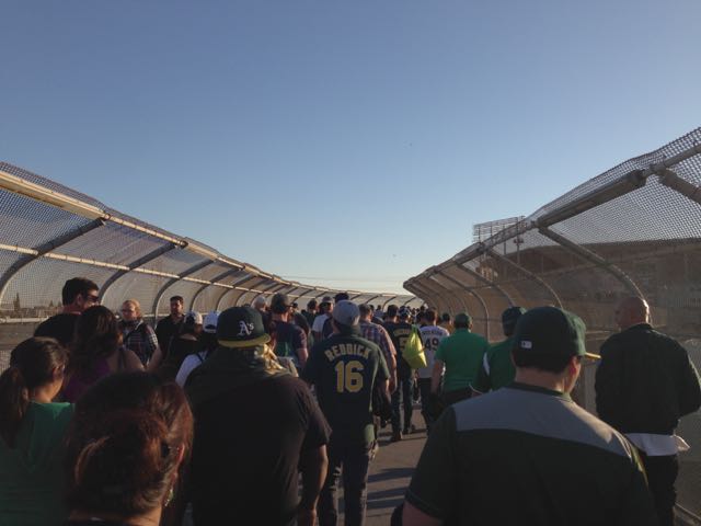Speaking of that redone BART bridge, that’s part of the opportunity. For decades now A’s, Raiders, and Warriors fans have gotten desensitized to the concrete-and-chainlink cage that takes them from the BART station to the venues. The biggest compliment anyone can make about the BART bridge is that it’s serviceable. Otherwise it’s generally a negative. It looks foreboding, especially the part over the railroad tracks where the chainlink completely covers you. At 20 feet wide, it’s subject to frequent foot traffic jams, usually caused by vendors taking up a third of the walkway on either side. And it ends with Joe Fan face-to-face with Mt. Davis’s hulking backside. It’s not particularly pleasant. The experience is conducive to simply walking as fast as possible. Rare is the leisurely stroll across.