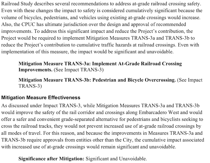 What will they be fighting over? Some of the conclusions in the report declare that impacts are significant and unavoidable. They mostly center around the rail crossing on the Embarcadero. There is a plan for a pedestrian/bicycle bridge at Jefferson or MLK that would connect the ballpark and development to the transportation hub. Beyond that, all crossings in the immediate area will be done at grade. As we’ve discussed previously, that invites danger.