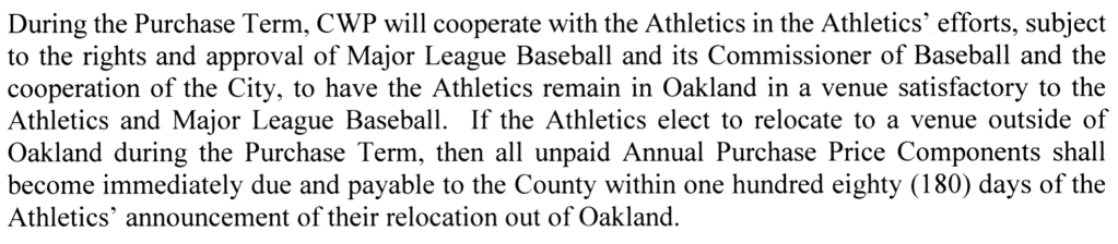 Practically, this shouldn’t matter much if the A’s stay in Oakland, regardless of whether it’s at Howard Terminal or the Coliseum. In that context it’s a reasonable exchange. The County added a poison pill provision in which the A’s have to pay off all remaining debt within 180 days of announcing they will move away from The Town. Hypothetically, if the A’s announce they’re moving this week while they’re hobnobbing in Vegas, they will owe the County $65 million by the end of the year. Presumably, that’s on top of the existing lease obligations with the Coliseum JPA, of which the A’s won’t be a full partner until the debt is retired.