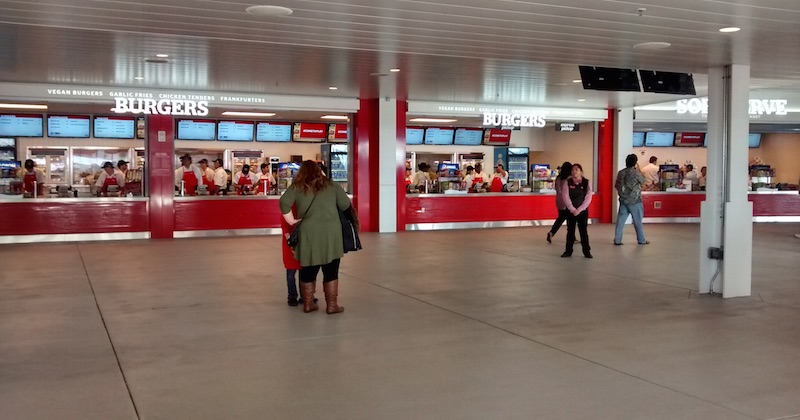The biggest achievement is the Monument Garden, a spacious and quiet mini-museum along the lower concourse. Suites block access access to regular seats, allowing Populous to eliminate restrooms and concession stands, replacing them with this meditative space. The Braves are the longest continually operating franchise in MLB, and the team will let you know about it with numerous old jerseys, a long timeline covering the team’s history in Boston, Milwaukee, and Atlanta, and the various Hall of Fame Braves. BBHoF plaques are mounted along the concourse wall, while their numbers stand in water features in the center of the Garden. While it doesn’t have a bar as in Seattle, there’s a lot more history to cover, so take your drink in and meditate in the Garden for a while. Having a concourse view is preferable, but if you’re going to remove that view, at least give fans something cool like this.