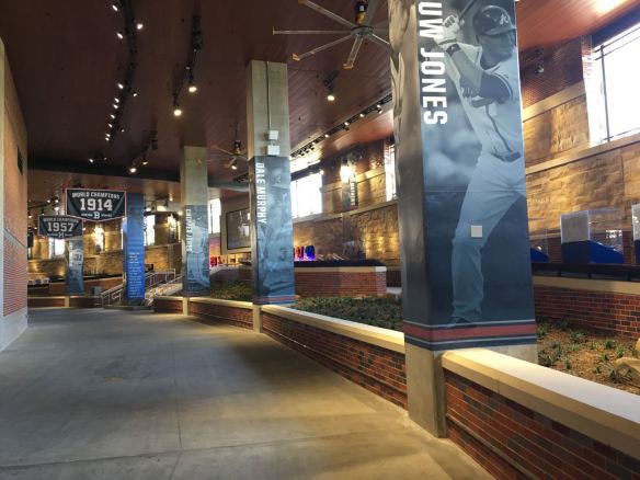 Like it or not, the theme everywhere at The Battery is Coming Soon. While the main plaza beyond right field has retail and restaurant tenants, many of the other buildings to the south (bottom of pic above) are not fully completed. The developers managed to get commitments to thousands of apartment leases, ensuring that there will be some amount of activity when the Braves aren’t playing. Signs on the ground level advertise a good mix of retail chains and local establishments to come. It’s hard to say how successful this will all be because the Cumberland area where The Battery is located already has three large shopping centers in place, including a major regional mall. And with the Braves treading water at the .500 mark, the team for now is a coming attraction, whereas the ballpark is already in place.