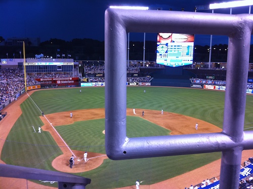 I walked up at 5:30 PM and got myself a nice seat, 8 rows behind the plate, for $15.50. Had I gotten there earlier, I could’ve gotten a $5 general admission seat. Oh well. As with most minor league games, the atmosphere was relaxed. The results don’t carry as much weight as in the majors. While the Beavers have underperformed recently at the gate, this game was the last scheduled fireworks game of the year, bringing out an announced crowd of 9,983.
